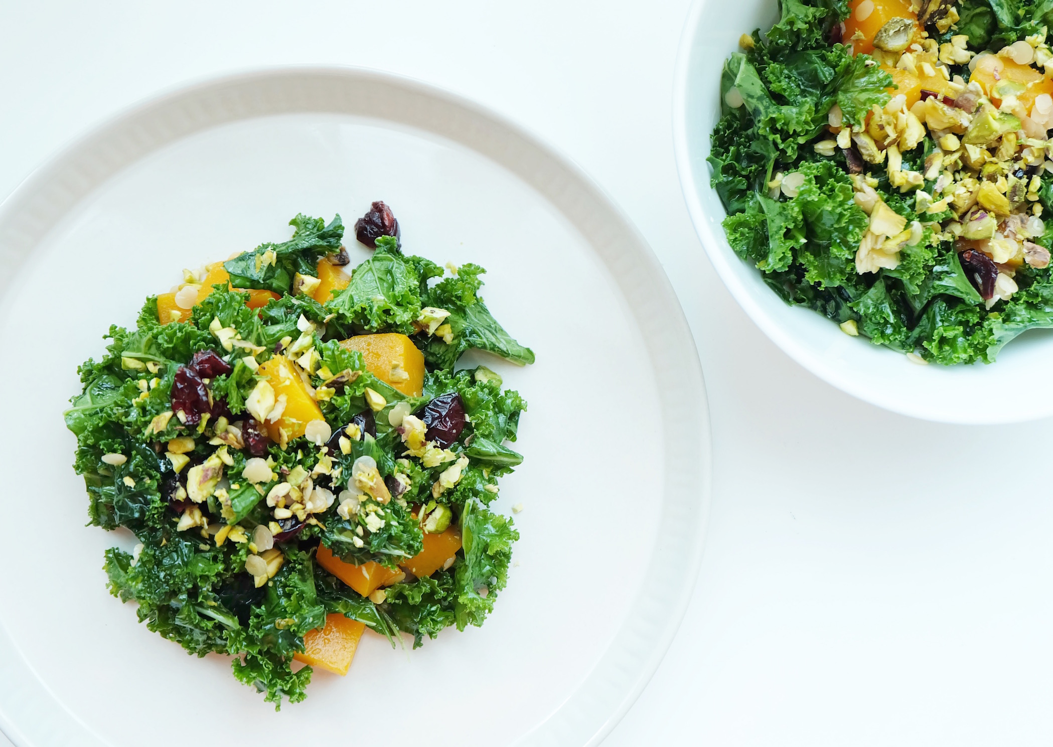 I wanted to have more raw kale in my diet and I hated how tough kale is when raw. So I found out that the amazing technique of massage kale salad with olive oil. And so I did. And then I added another ingredient in, another in and another and hey! It actually taste pretty darn gooooood.